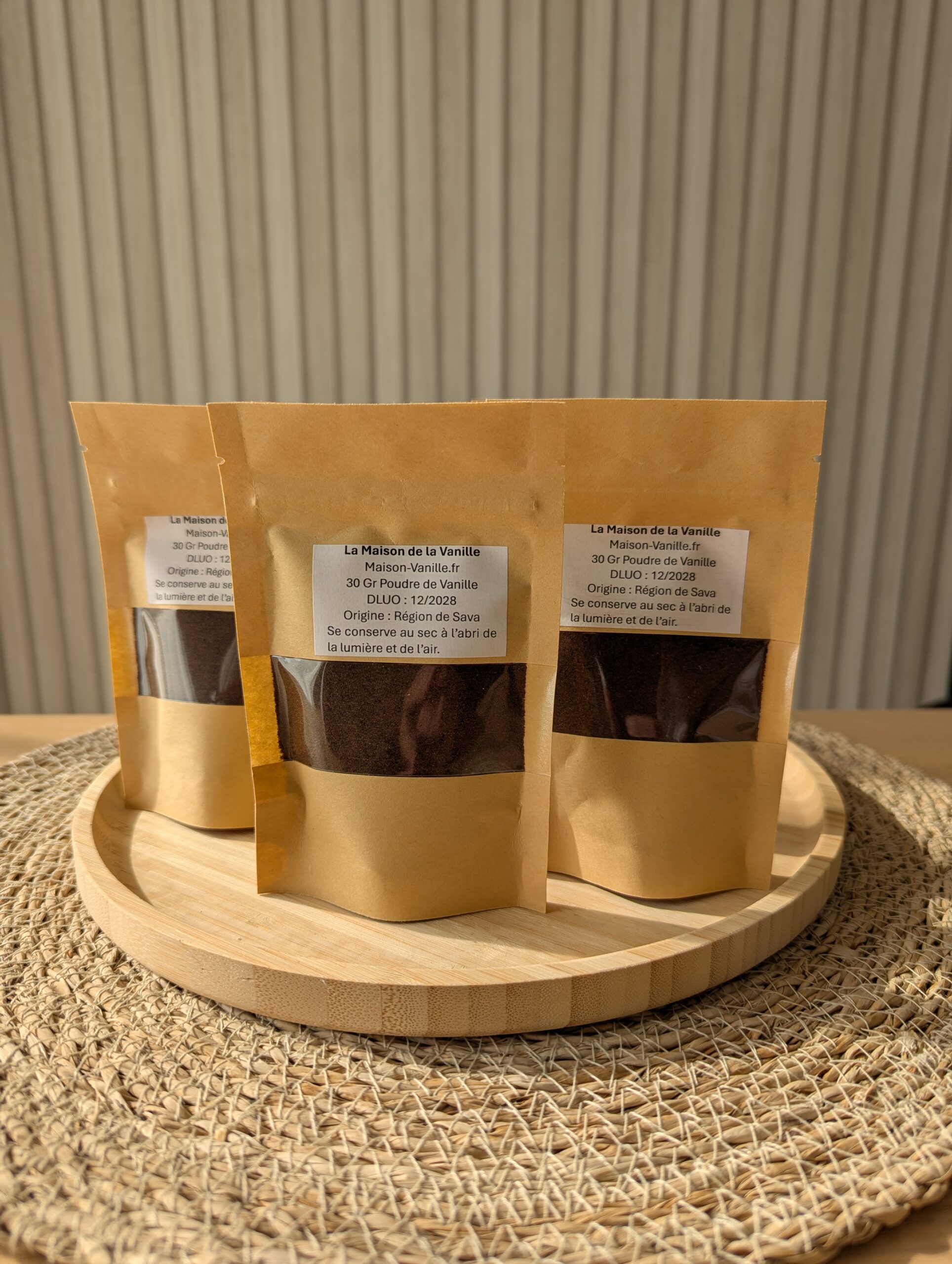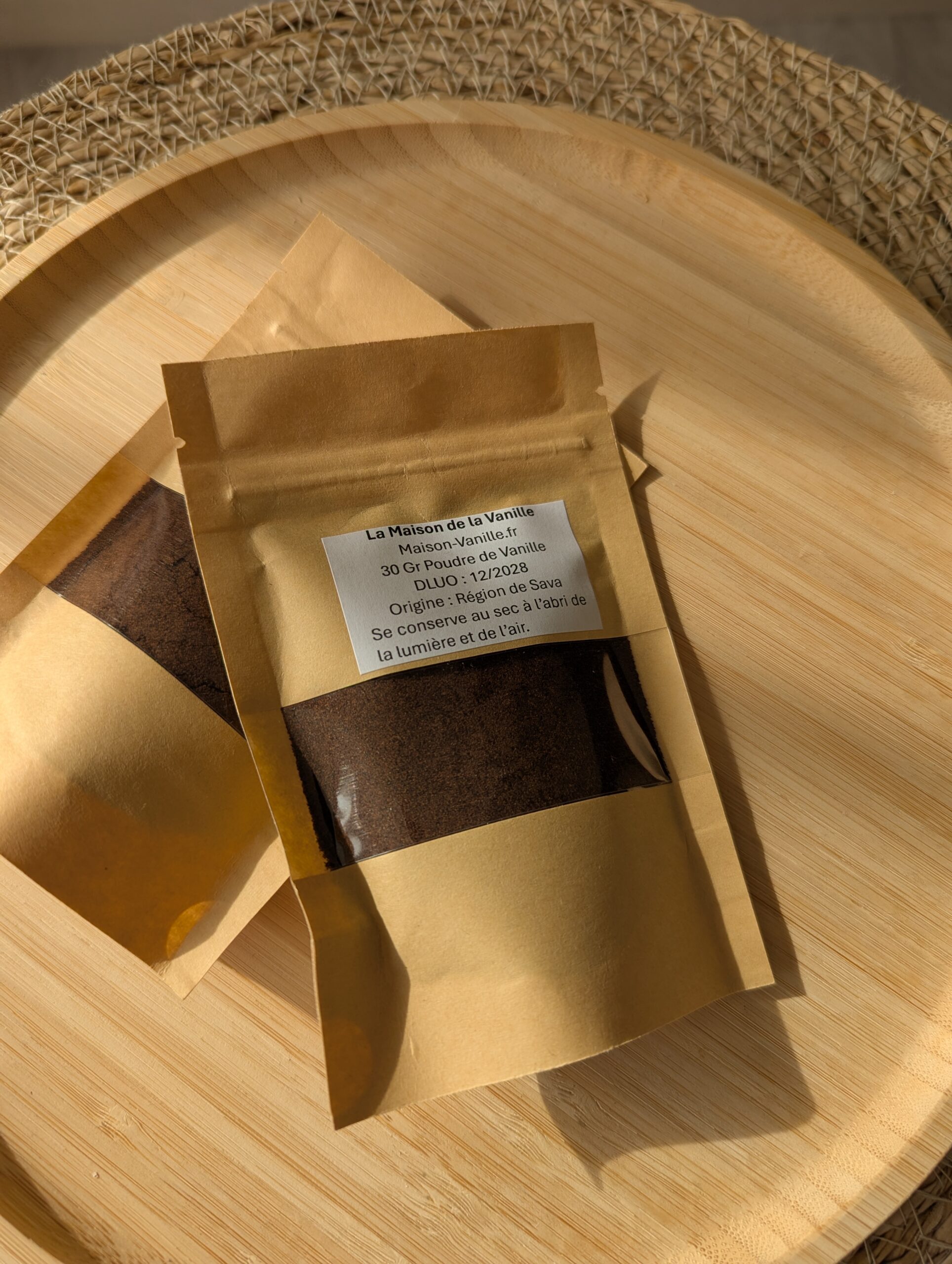 Conditionnée dans un sachet Kraft alimentaire refermable, notre poudre de vanille est protégée de la lumière et de l’humidité. Ce conditionnement préserve sa fraîcheur et la puissance de ses arômes pour une utilisation durable.